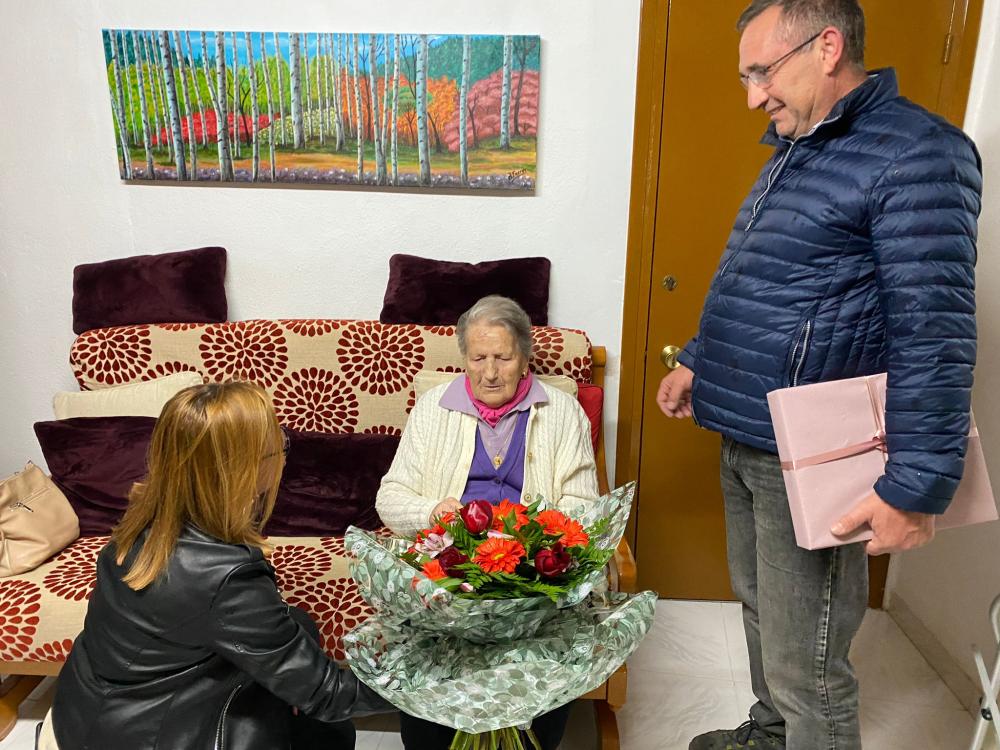 El alcalde y la teniente de alcalde han felicitado a la centenaria a quien le han entregado un ramo de flores y una placa en nombre del Ayuntamiento